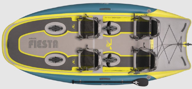 Hobie’s inflatable kayaks are portable, lightweight, agile, and lightning-fast. Powered by the MirageDrive with Glide Technology and Kick-Up Fins, the all-new iTrek Series strikes the perfect balance between superior performance and portability. Introducing the all new Mirage iTrek Fiesta. The Fiesta is fast and lightweight, but Hobie didn’t stop there. It’s versatile, too! With room for the whole family, Hobie integrated social seating, making it the perfect watercraft for spending time on the water playing games or putting your feet up and hanging out. With four seats and two MirageDrives with Glide Technology & Kick-Up Fins, and its high-tech drop stitch and triple-chanber construction, you’ll have the spare and the power to bring the whole family along for the party of a lifetime. With big kids or four adults, add two optional MirageDrives and everyone hang on to your hat! State-of-the-art seating featuring cup holders and breathable nano-mesh fabric, rolling travel bag with portable hand pump and high-volume electric pump. |
